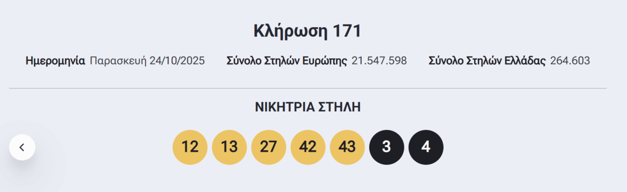 Οι τυχεροί αριθμοί που ανέδειξε η κλήρωση του Eurojackpot το βράδυ της Παρασκευής, 28/11/2025 είναι οι εξής: 12, 16, 35, 46, 50 και 3, 5.