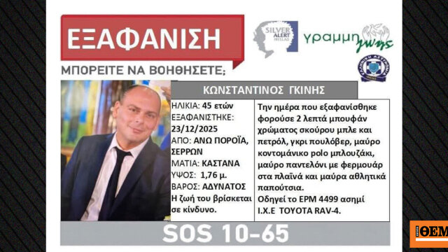 Η εξαφάνιση του 45χρονου Κωνσταντίνου Γκίνη δηλώθηκε στο Αστυνομικό Τμήμα Ποροΐων από την σύζυγό του, όταν διαπιστώθηκε ότι απουσίαζε από το σπίτι για περισσότερες από 24 ώρες, χωρίς να έχει εμφανιστεί ούτε στην υπηρεσία του.