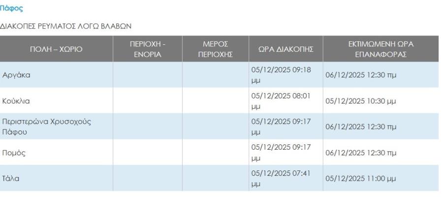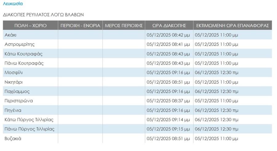 Συγκεκριμένα, επηρεάζονται αρκετές περιοχές στις Επαρχίες Λευκωσίας, Λεμεσού και Πάφου.