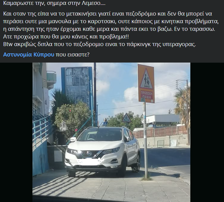 Σύμφωνα με ανάρτηση στην ομάδα «ο Γάρος της ημέρας» αλλά και ανάρτηση στην ομάδα «CY Police Checkpoints», ένας οδηγός πάρκαρε σε πεζοδρόμιο, μπροστά από είσοδο για ράμπα της πολυκατοικίας στη Λευκωσία ενώ μια άλλη οδηγός στη Λεμεσο, η οποία πάρκαρε επίσης σε πεζοδρόμιο, εμπόδιζε όποιον θα προσπαθούσε να περάσει.