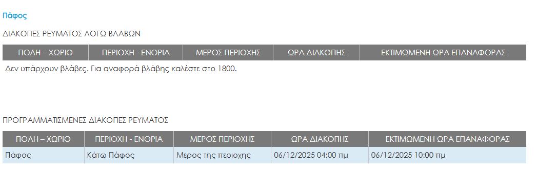 Συγκεκριμένα στη Λευκωσία επηρεάζονται οι περιοχές Γέρι, μέρος της περιοχής Αγλατζίας και μέρος της περιοχής Λακατάμειας ενώ στην Πάφο επηρεάζεται μέρος της περιοχής Κάτω Πάφος.