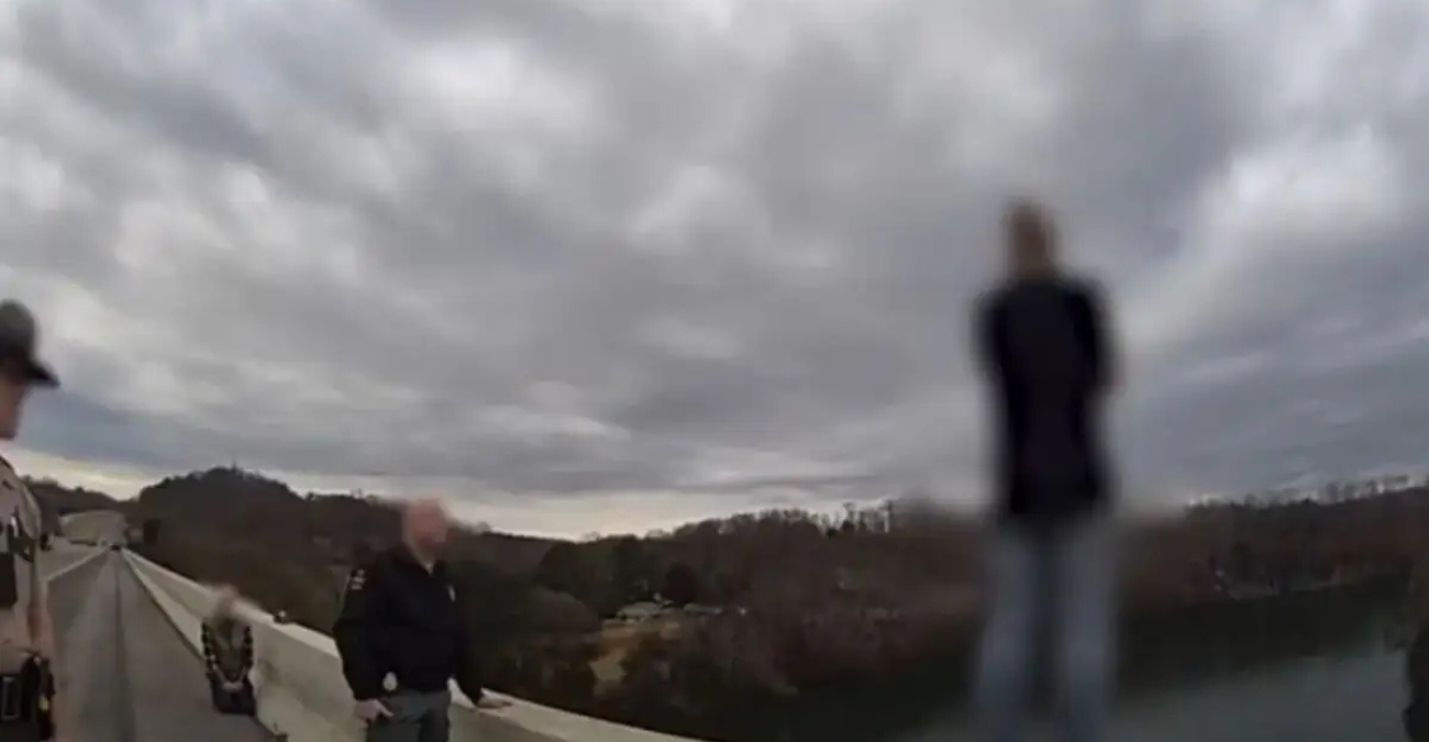 Όπως φαίνεται στο βίντεο, η γυναίκα στέκεται στην άκρη της γέφυρας στο Τενεσί στις ΗΠΑ, ενώ αστυνομικοί και προσωπικό του ΕΚΑΒ προσπαθούν να την πείσουν να κατέβει. Ξαφνικά, ένας αστυνομικός της τροχαίας αναλαμβάνει δράση, την αρπάζει και την τραβάει από την άκρη της γέφυρας και την πετάει με ασφάλεια στο δρόμο.
