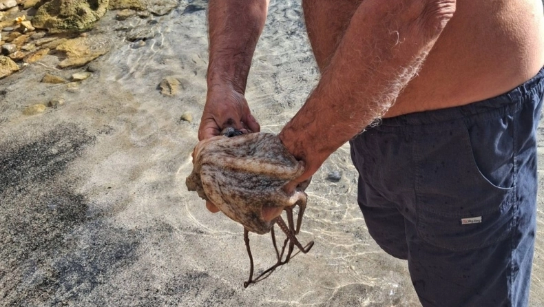 Μια χειμερινή βουτιά στα Χανιά εξελίχθηκε σε απρόσμενη συνάντηση, όταν λουόμενος βγήκε από τη θάλασσα με ένα χταπόδι τυλιγμένο στο πόδι του.